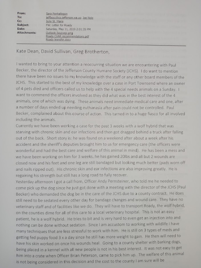 Below is an email with the Subject: Wolf Hybrid from Center Valley Animal Rescue Sara Penhallegon to Officer Wendy Davis September 3rd, 2020 just 2 months before they SEIZED the GUY (Moses) for Good, after years of conspiring with Government Representatives throughout Jefferson County Washington.